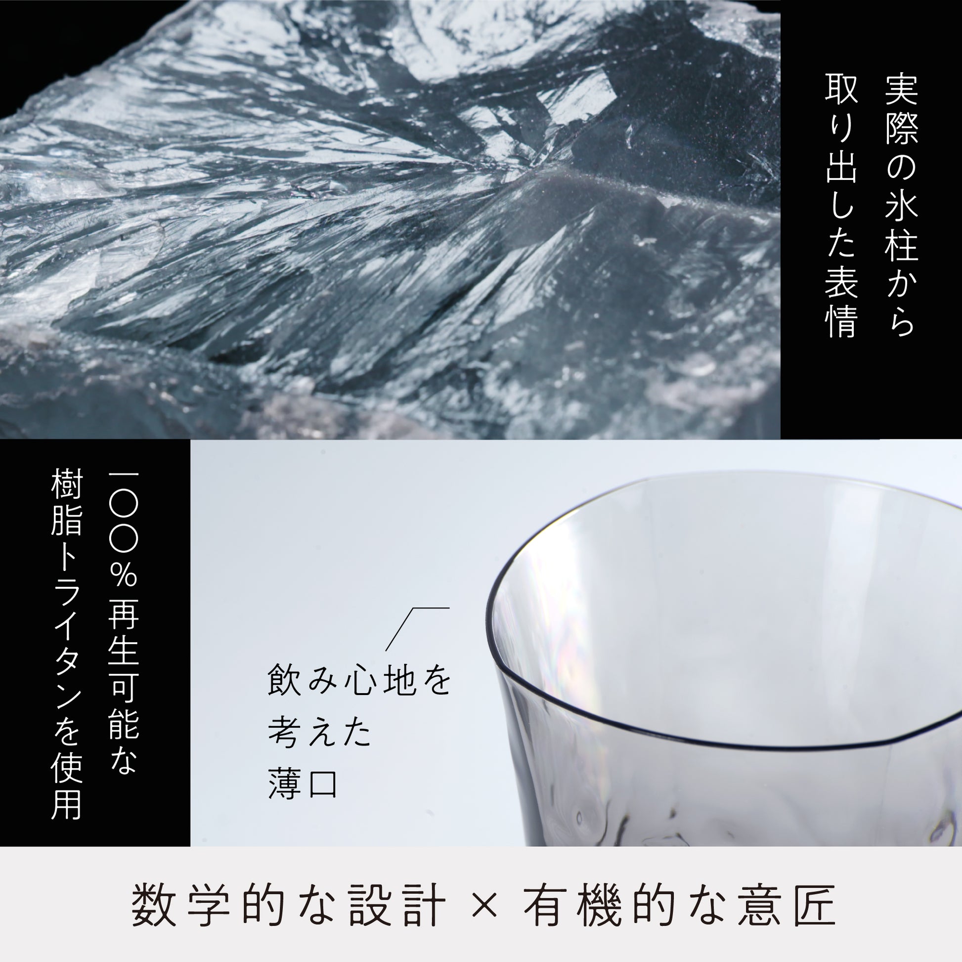 【こだわりのある人の普段使い食器】雪解け水の恵にそのまま触れるような体験。「容器」ではなく、「水そのもの」に触れるような体験を目指し、実際の溶け始めた氷を3Dスキャンし、デザインしました。一見ありふれた存在である「水」との接し方に新たな発見を感じていただければと思います。【使いやすく、お手入れも簡単】割れない素材 “トライタン" を採用し、さらに傷を目立たせない機能となるように設計することで、普段遣いに最適な商品になっております。ステンレスや金属は一切使用していないため、アレルギーも方にも安心です。【アウトドアやピクニックでも大活躍】非常に丈夫で傷もつきにくいためため、ピクニックやキャンプ、BBQでも活躍します。どんなシーンもおしゃれに彩ります。【生涯破損保証付き】自信をもってお届けできる耐久性だから、「生涯破損保証」をお付けします。 割れ・欠けの心配がない。非常に丈夫な素材です。【環境に配慮した食器、安心の日本製】100%再利用可能な素材を採用し、美観を長くつけるデザインなので、環境負荷を低減しております。 【商品の仕様】原料:飽和ポリエステル(トライタン) 耐熱温度:100℃ 耐冷温度:-20℃ 食洗機、漂白剤対応